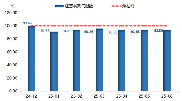 二季度,经营类景气指数保持稳定。4-6月,经营类景气指数保持在93.88点。4-5月,产值、销售额、订货量、盈利状况、流动资金能力、用电量、经营成本七项指标指数均保持稳定,6月,流动资金和经营成本两项指标指数出现上升,指数分别为90.48点和101.19点,企业经营情况有所好转,经营压力略有下降。