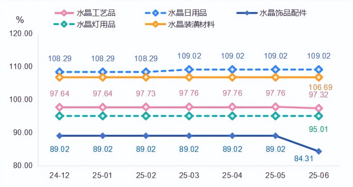 水晶饰品配件是市场竞争最激烈的细分领域。2025年6月,其价格指数环比下跌5.03%,收于84.31点,反映出明显的“以价换量”趋势。一方面,源于产能过剩,大量中小企业集中于低端饰品生产;另一方面,电商平台的促销机制加剧了价格战。然而,值得注意的是,2025年上半年,水晶饰品高端市场表现亮眼。例如,明星效应带动年轻消费者的需求,伊能静、张歆艺等明星直播间带货的水晶饰品销量同比增长40%。个性化、轻奢化设计的水晶饰品也仍具有增长潜力,定制刻字项链、星座主题手链等产品在抖音、小红书等社交平台走红,带动部分品牌实现差异化突围。